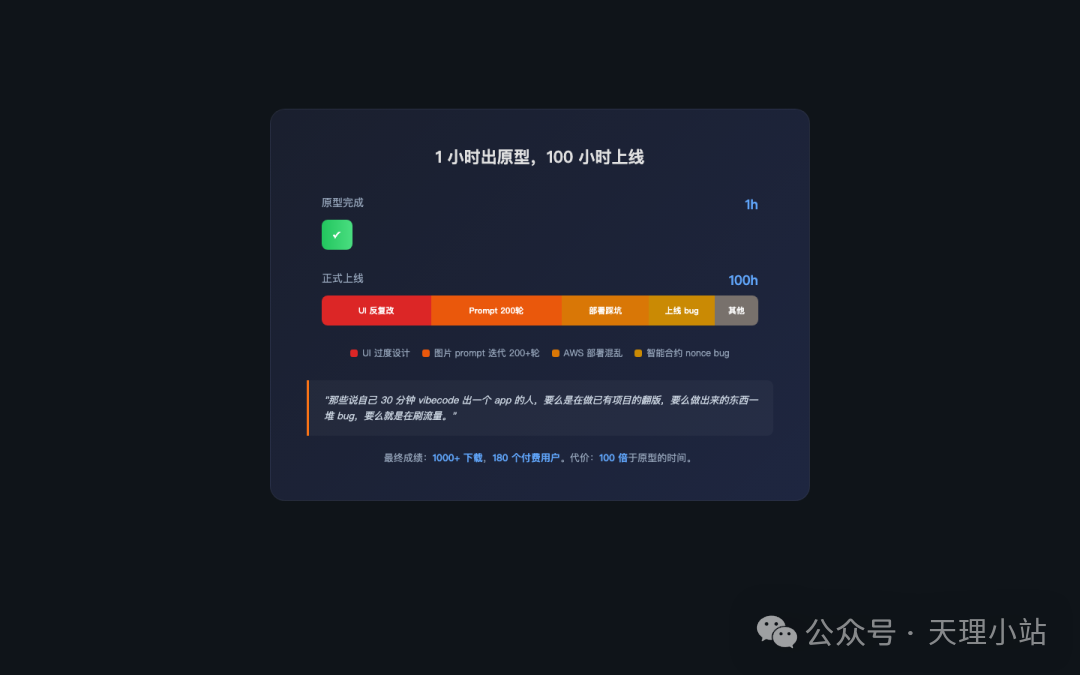 一、1小时出原型,100小时上线一个开发者用AI做了一个Farcaster上的NFT小应用Cryptosaurus——用户上传头像,AI生成恐龙风格的NFT。原型用了1小时。上线用了100小时。那99小时花在哪了?AI写的UI翻来覆去改了好几版配色,每次都过度设计。图片生成的prompt迭代了200多轮(背景里冒出随机...