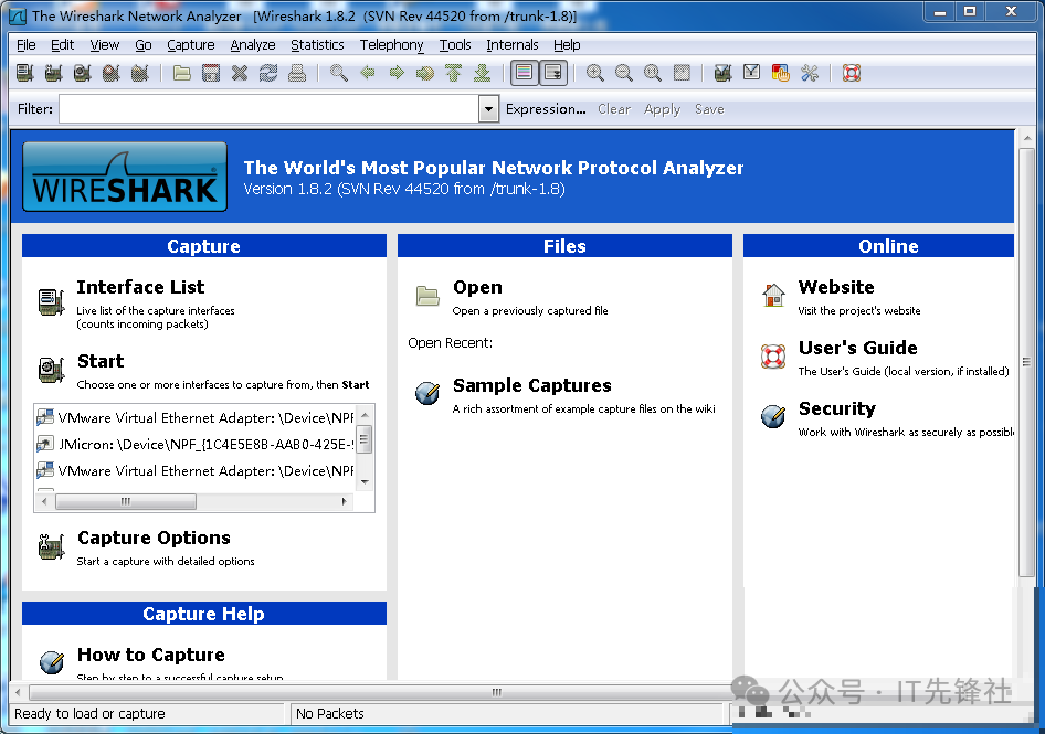 wireshark开始抓包开始界面wireshark是捕获机器上的某一块网卡的网络包,当你的计算机系统内配置了多个网络接口设备时,你需要挑选一个合适的网络接口卡。点击Caputre->Interfaces..将会呈现一个对话框,请挑选合适的网络适配器。然后点击Start按钮,开始抓包Wireshark窗口介绍WireS...