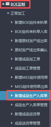 1.进入ERP系统之后,点击“BOE定制”,点开“正常加工”,然后找到“新增成品生产入库单”。