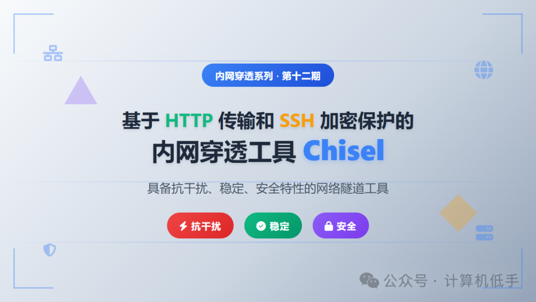 一、简介•Chisel是一个易于使用、高效、稳定、安全的内网穿透工具•可以穿透转发TCP/UDP协议相关的服务,通过HTTP传输,并通过SSH进行数据加密保护•单一可执行程序,支持多种操作系统快速安装,也提供Docker镜像•开源地址参考:https://github.com/jpillora/chisel•C/S架...