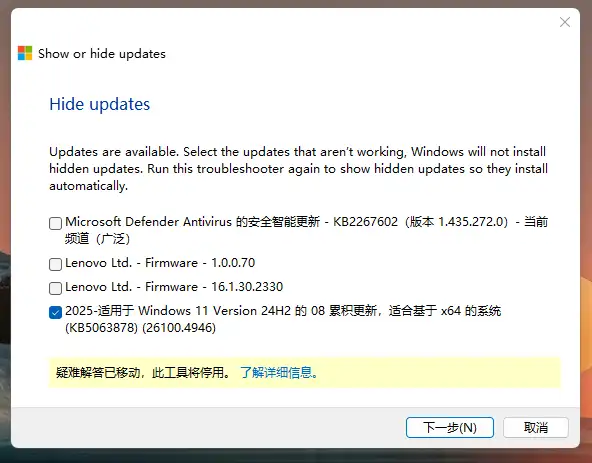 下载微软官网提供的「Show or hide updates」工具,临时隐藏受影响更新补丁推送安装。