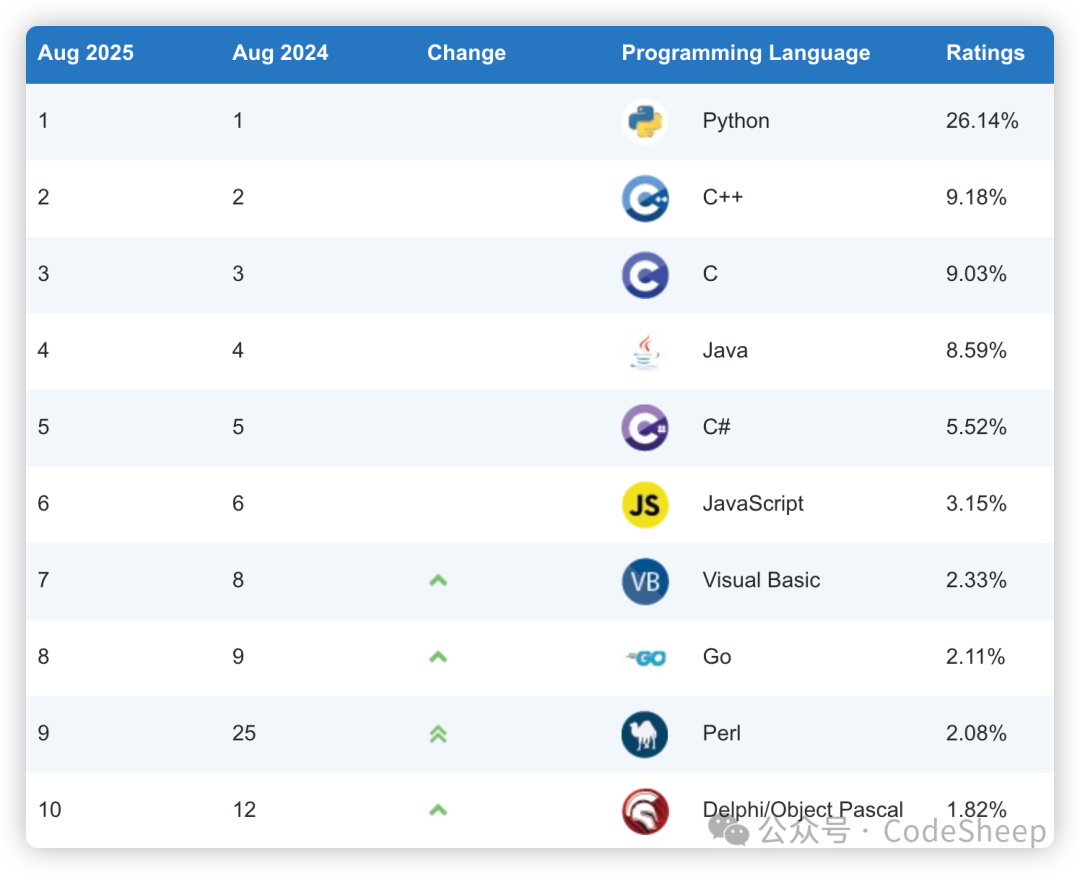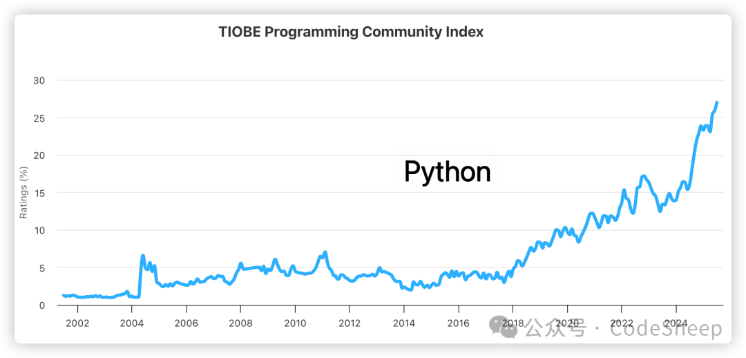 ![]() 其中 Python 可谓是一骑绝尘,与排名第二的 C++ 甚至拉开了近 17% 的差距,呈现了断崖式领先的格局。 不愧是 AI 领域当仁不让的“宠儿”,这势头其他编程语言简直是望尘莫及! 另外还值得一提的就是 C 语言。 最近这几个月 C 语言的 TIOBE Index Ratings 比率一直在回升,这说明其生命力还是非常繁荣的,这对于一个已经诞生 50 多年的编程语言来说,着实不易。 C 语言于上个世纪 70 年代初诞生于贝尔实验室,由丹尼斯·里奇(Dennis MacAlistair Ritchie)以肯·汤普森(Kenneth Lane Thompson)所设计的 B 语言为基础改进发展而来的。 ![]() 就像之前 TIOBE 社区上所描述的,这可能主要和当下物联网(IoT)技术的发展繁荣,以及和当今发布的大量小型智能设备有关。毕竟 C 语言运行于这些对性能有着苛刻要求的小型设备时,性能依然是最出色的。 说到底,编程语言本身并没有所谓的优劣之分,只有合适的应用场景与项目需求。 按照官方的说法,TIOBE 榜单编程语言指数的计算和主流搜索引擎上不同编程语言的搜索命中数是有关的,所以某一程度上来说,可以反映出某个编程语言的热门程度(流行程度、受关注程度)。 而通过观察一个时间跨度范围内的 TIOBE 指数变化,则可以一定程度上看出某个编程语言的发展趋势,这对于学习者来说,可以作为一个参考。 Java:我啥场面没见过![]() 曾经的 Java 可谓是互联网时代不可或缺的存在。早几年的 Java 曲线一直处于高位游走,彼时的 Java 正是构成当下互联网生态繁荣的重要编程语言,无数的 Web 后端、互联网服务,甚至是移动端开发等等都是 Java 的擅长领域。 而如今随着 AI 领域的发展和繁荣,曾经的扛把子如今似乎也感受到了前所未有的压力。 C语言:我厉兵秣马![]() 流水的语言,铁打的 C。 C 语言总是一个经久不衰的经典编程语言,同时也是为数不多总能闯进榜单前三的经典编程语言。 自诞生之日起,C 语言就凭借其灵活性、细粒度和高性能等特性获得了无可替代的位置,就像上文说的,随着如今的万物互联的物联网(IoT)领域的兴起,C 语言地位依然很稳。 C++:我稳中求进![]() C++ 的确是一门强大的语言,但语言本身的包袱也的确是不小,而且最近这几年的指数趋势稳中求进,加油吧老大哥。 Python:我逆流而上![]() 当别的编程语言都在震荡甚至下跌之时,Python 这几年却强势上扬,这主要和当下的数据科学、机器学习、人工智能等科学领域的繁荣有着很大的关系。 PHP:我现在有点慌![]() PHP:我不管,我才是世界上最好的编程语言,不接受反驳 好了,那以上就是今天的内容分享了,感谢大家的阅读。 阅读原文:点击这里 该文章在 2025/9/1 15:11:14 编辑过 |