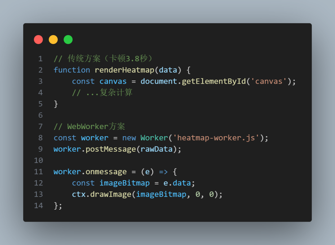 当你的页面出现卡顿时,当你的动画掉帧时,当用户抱怨你的应用响应迟缓时——还在用 setTimeout 假装异步?是时候直面浏览器渲染的真相了! 本文将通过 3 个真实场景,带你彻底掌握现代Web性能优化的核武器:WebWorker