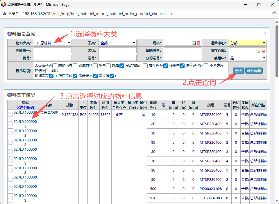 2.进入界面之后,点击选择发货仓库,备注有需要可以补充。 3.接着来到下方点击“物料编码”,会弹出物料信息窗口。 在弹出窗口内,按图操作:点击选择物料大类,点击查询。然后点击对应的物料信息。 注:如果找不到物料信息可输入编号或名称筛选。 4.选好物料后,检查并确认物料信息,根据情况提交选择“制单待退料”或“立即退料” 5.提交后,回到左侧功能菜单找到“退料到BOE出库单管理” 6.进入界面后,按图操作:可用代码或名称查找,点击查询。然后点击对应物料信息,先进行出库,再上传BOE。 流程结束。 点晴模切ERP更多信息:http://moqie.clicksun.cn,联系电话:4001861886 该文章在 2025/9/18 11:41:11 编辑过 |