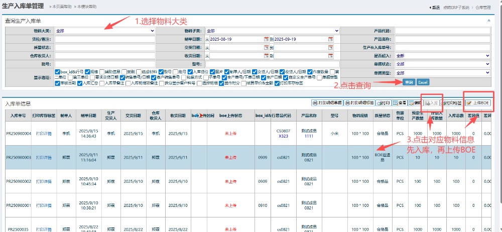 接着按图操作:填写入库数量、日期以及入库仓库(要与上面一致)。然后提交选择“制单待审核”或“立即入库”。 注:超订单是指超出订单内指定的数量 ,如有超订单可填写超入比例提交 5.提交之后,回到左侧功能菜单里找到“返退品生产入库管理” 6.进入界面后,按图操作:点击选择物料大类,点击查询。然后点击对应物料信息(合格品或制损品),先进行入库,再上传BOE。 ![]()