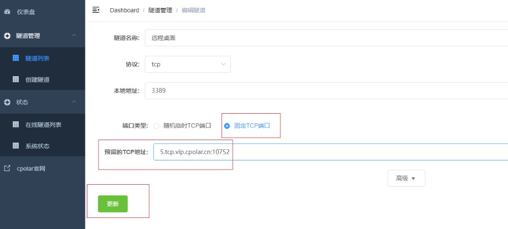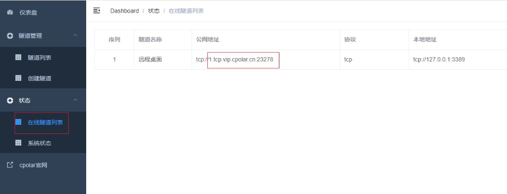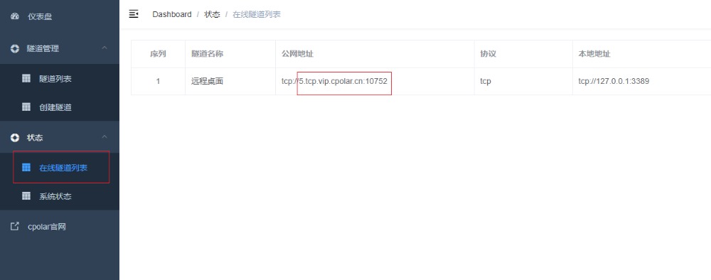 隧道更新成功后,点击左侧仪表盘的状态——在线隧道列表,可以看到公网地址已经更新成为了和我们在官网固定的TCP地址和端口一致。