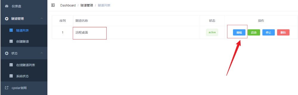 再次打开cpolar web ui管理界面,点击左侧仪表盘的隧道管理——隧道列表,找到我们上面创建的TCP隧道,点击右侧的编辑